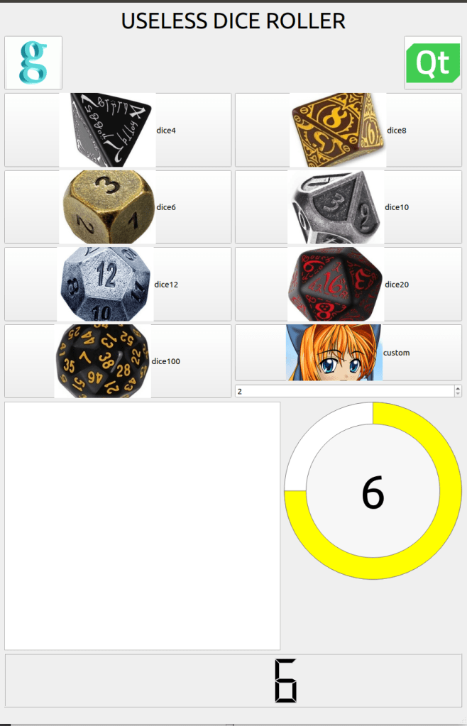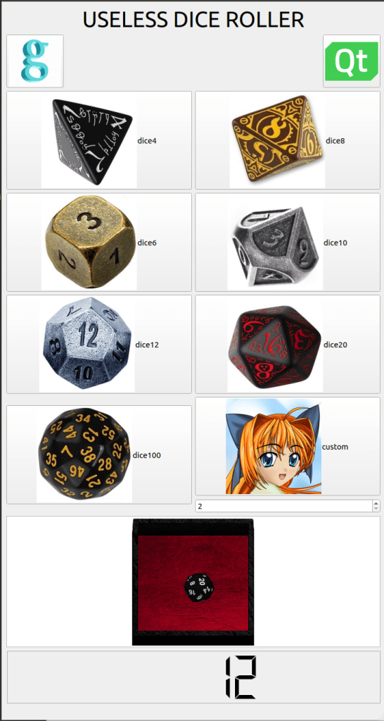 Useless Dice Roller è una app per Android che simula il lancio dei dadi. E’ programmata in C++ usando le librerie Qt. Per il logo ho modificato un’immagine prelevata da opengameart e acreditata nell’app. E’ presente un piccolo banner Google AdMob. Da opegameart.org provengono anche gli spritesheet per animare il dado 20. Per gli altri dadi non disponevo delle animazioni ed ho visualizzato al loro posto delle corone circolari che si riempiono e svuotano in attesa del risultato del lancio.